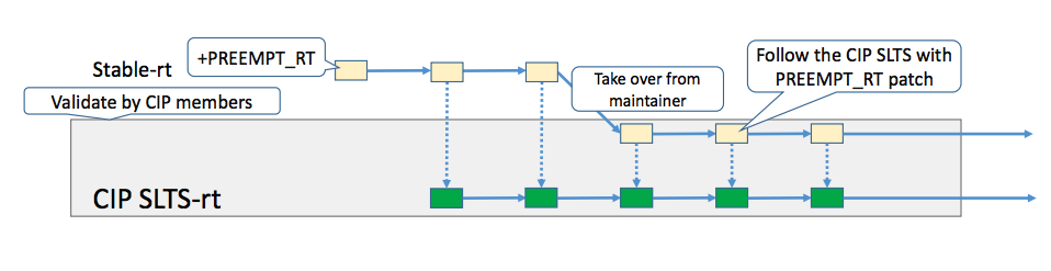 While the Linux Foundation’s Real-Time Linux collaborative project is working on getting the final features from the RPEEMPT_RT patchset into mainline kernel, there is no direct support a -rt flavor for the CIP kernel. There are stable real-time patches for 3.2, 3.10, 3.18, 4.1, 4.4 and 4.9. They are based on top of the LTS trees maintained by Greg Kroah-Hartman, Sasha Levin and Ben Hutchings.